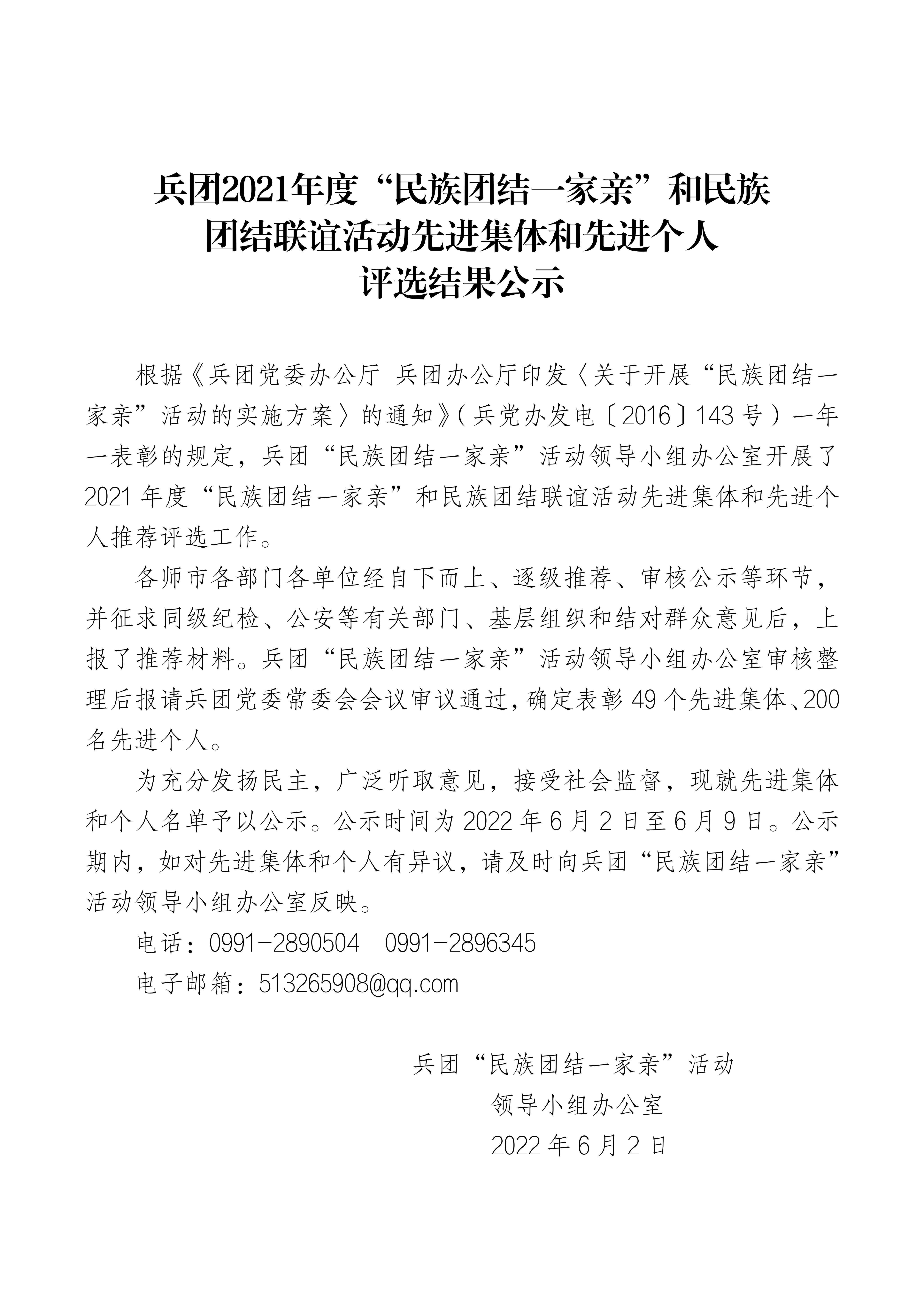 根据《365app官方版下载_bt365网上娱乐_bet3365备用党委办公厅 365app官方版下载_bt365网上娱乐_bet3365备用办公厅印发〈关于开展“民族团结一家亲”活动的实施方案〉的通知》(兵党办发电〔2016〕143号)一年一表彰的规定,365app官方版下载_bt365网上娱乐_bet3365备用“民族团结一家亲”活动领导小组办公室开展了2021年度“民族团结一家亲”和民族团结联谊活动先进集体和先进个人推荐评选工作。